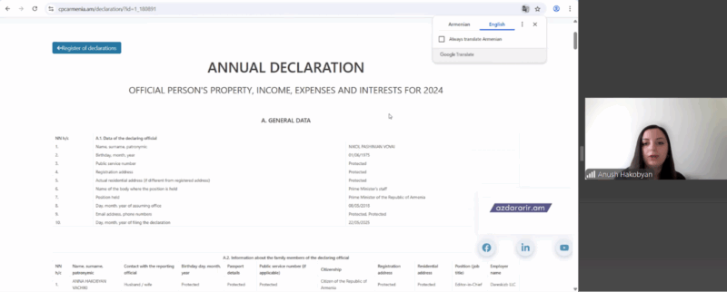 The framework in Armenia ensures the mandatory publication of asset and interest declarations online, through the Corruption Prevention Commission’s registry. The data allows public access to comprehensive information on declared interests, assets, and liabilities of public officials and their close associates, which is published annually and can be easily consulted. This level of accessibility promotes transparency and enables monitoring by the corresponding institutions, but also by journalists and civil society watchdogs.