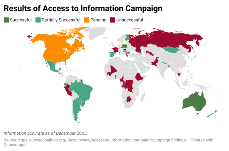 Through Freedom of Information (FOI) requests, the UNCAC Coalition has collaborated with civil society in over 46 countries to assess how governments disclose information on UNCAC implementation review cycles, relying on national access to information laws where available. Where such laws are absent, we encourage the use of UNCAC’s transparency principles under Articles 10 and 13.