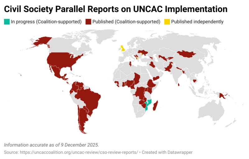 - In 2025, we supported the production and publication of 9 parallel reports assessing national UNCAC implementation, bringing a civil society perspective to the UNCAC review process.