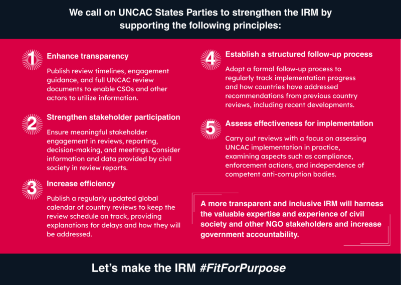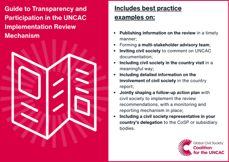 For more specific examples of how to meaningfully engage civil society in UNCAC reviews and ensure high standards of transparency, please refer to this blog post.