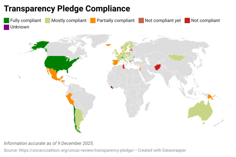 - Our Transparency Pledge compliance map shows both the level of compliance of States Parties that have signed the Pledge and which States have not signed it yet;