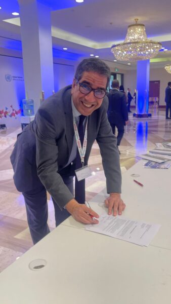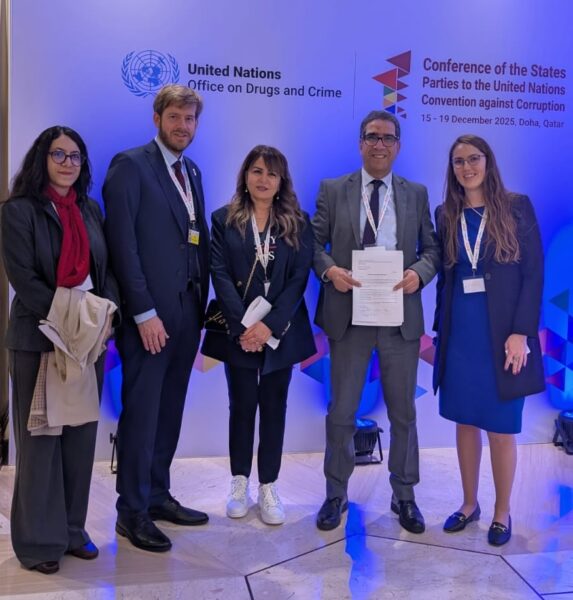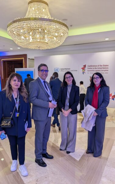 The Transparency Pledge was signed by Mr. Abdelaziz El Houari, Head of Departement of International Conventions/Chef de Department de Conventions International, L’Instance de Probité et de la Prévention et de Lutte Contre la Corruption in front of the CoSP11 plenary room in the presence of Nisrine Elhakkouni, Policy Officer, Directorate of Global Issues, Division of Security and Social Affairs, Ministry of Foreign Affairs, African Cooperation and Expatriates, as well as the Coalition’s Managing Director Mathias Huter, the Civil Society Engagement Lead Danella Newman, the Coalition’s Coordination Committee member representing the South-West Asia and North Africa Region Hilda Hilda Ajeilat, as well as the Coalition’s Analyst Ana Revuelta.