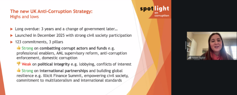 Finally, Helen Taylor, Deputy Director of Spotlight on Corruption, introduced the United Kingdom (UK)’s new Anti-Corruption Strategy, a comprehensive policy framework that has been welcomed by civil society in the UK (the UK Anti-Corruption Coalition) as a significant step forward. The strategy emphasises the protection, implementation, and enforcement of key international anti-corruption standards, including the UNCAC. It commits the UK to greater enforcement against corruption, intensifying efforts to dismantle kleptocratic networks by scaling up capacity to pursue professional enablers who facilitate corruption and wider economic crimes, and closing the loopholes that criminals exploit. It also seeks to reinforce the country’s international leadership through hosting an Illicit Finance Summit.