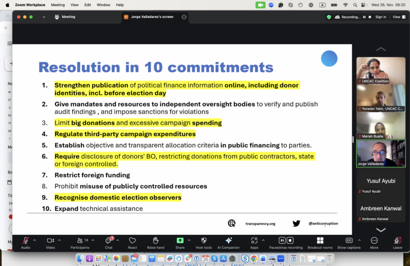 Jorge Valladares, Political Integrity Policy Lead at Transparency International Secretariat, presented the groundbreaking draft resolution on political finance transparency, the first in the CoSP’s history. Co-sponsored by Norway, Ghana, Albania, and Mongolia, the draft resolution aims to advance 10 key commitments, including: